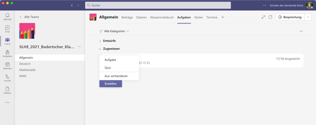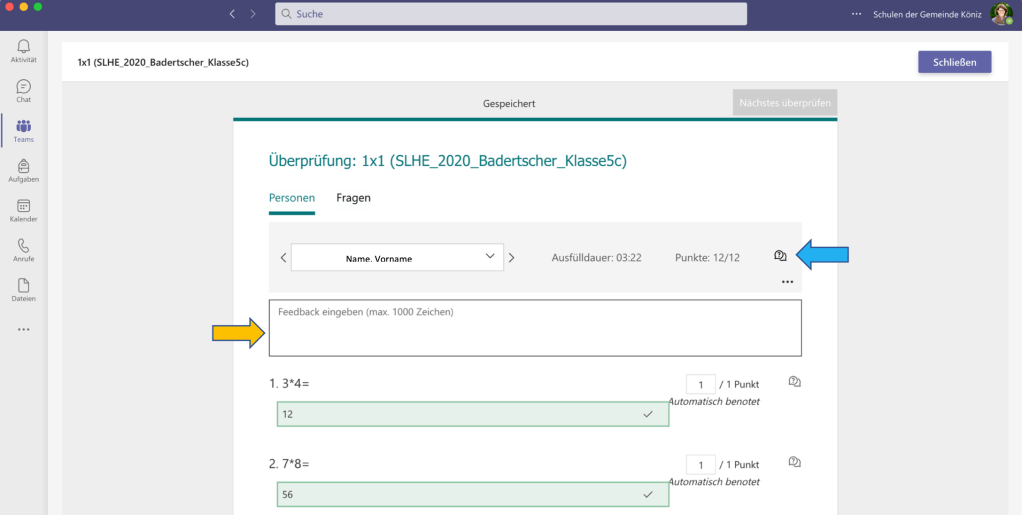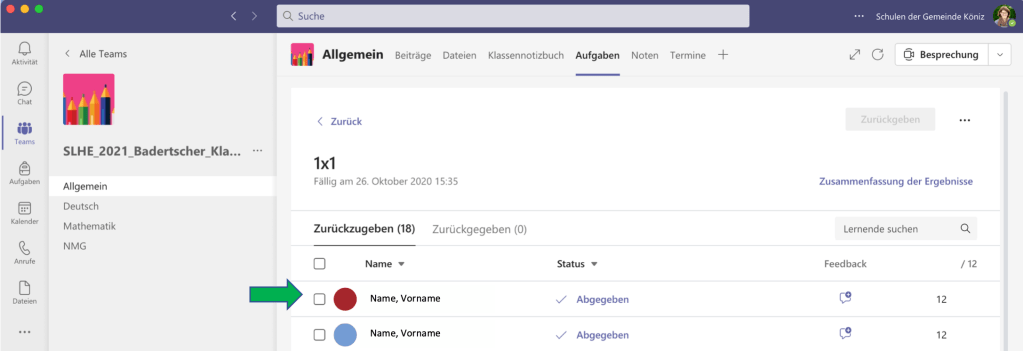 Ist eine Aufgabe in Teams erstellt, kann die Auswertung der Lehrpersonen auch gleich dort vorgenommen werden.