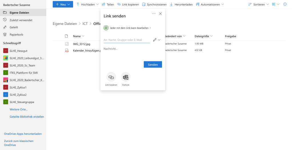 Es kann ein Link einer Datei geteilt werden oder eine Datei direkt mit bestimmten Personen geteilt werden.