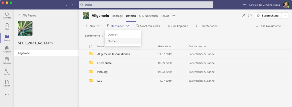 Fotos, Dokumente usw. können auf Teams hochgeladen werden. Um etwas hochzuladen muss zuerst das richtige Team ausgewählt werden.