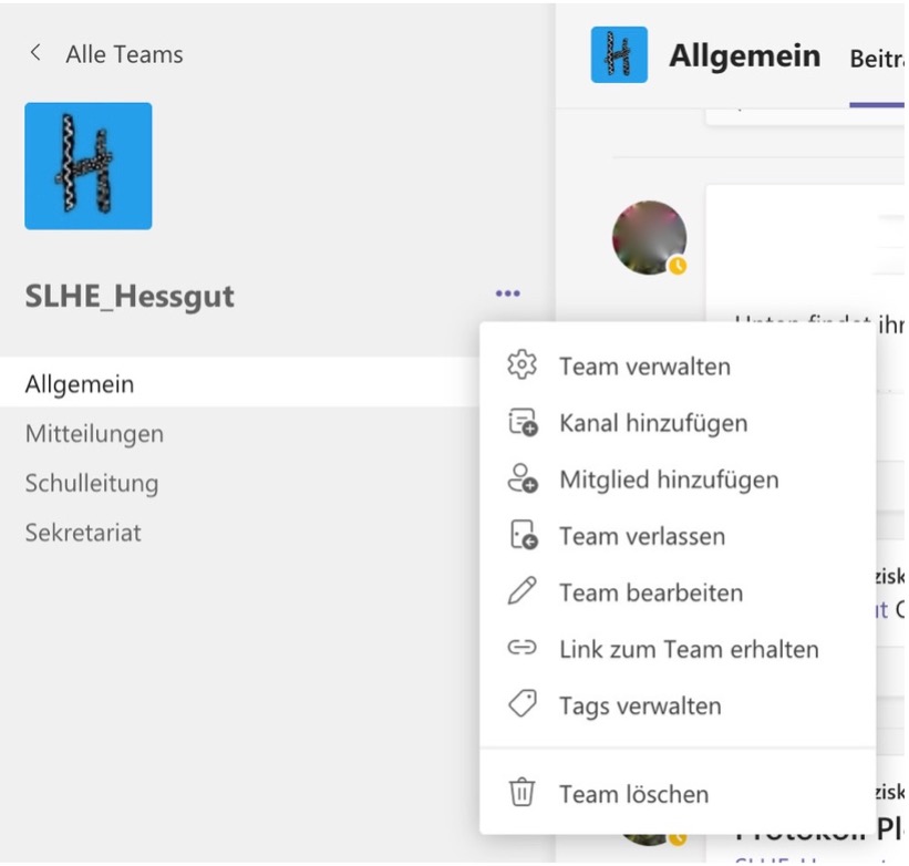 Die drei Punkte neben einem Teamnamen (auf der Hauptübersicht oder auch bei geöffnetem Team) ermöglichen das Bearbeiten.