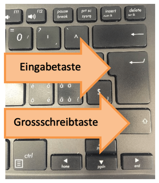 Ein Zeilenwechsel muss mit der Kombination mit einer der zwei Grossschreib-Tasten und Eingabetaste gemacht werden.