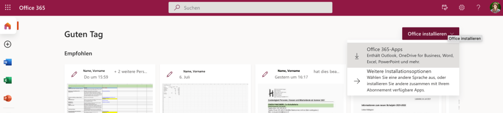 Auf der Startseite von Office 365 kann oben rechts Office installiert werden.