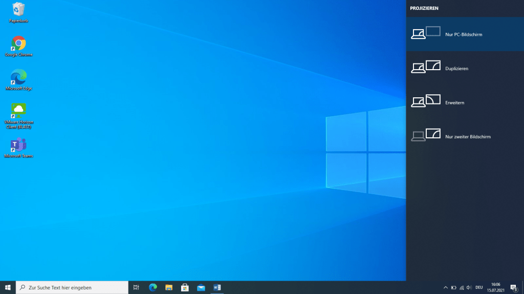 Ist der Beamer am Computer angeschlossen, kann mit der Tastenkombination Windows (Fenstersymbol neben der alt-Taste) und P die Bildschirmmöglichkeiten geöffnet werden.