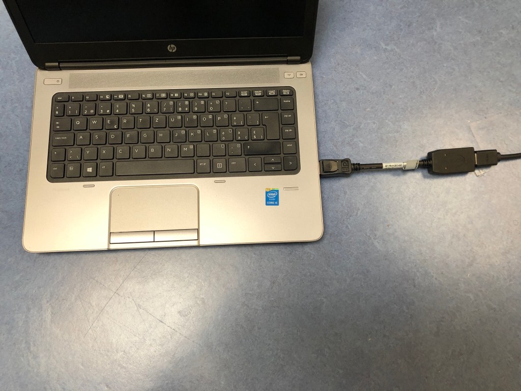 Die Schullaptops werden per Kabel an die Beamer angeschlossen.