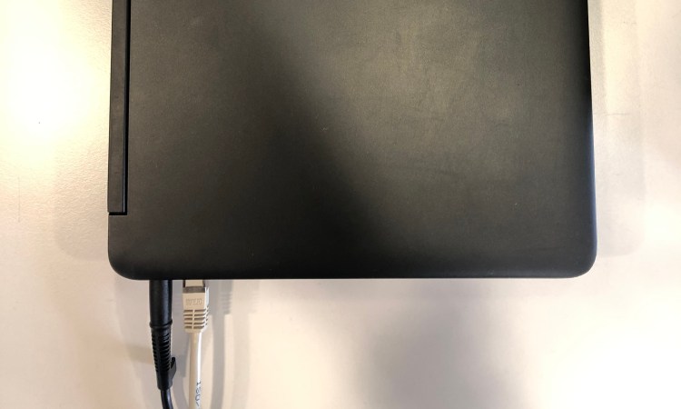 Die Schullaptops werden jeweils am Freitag an die Stromkabel und zusätzlich an die grauen oder schwarzen LAN-Kabel angeschlossen.