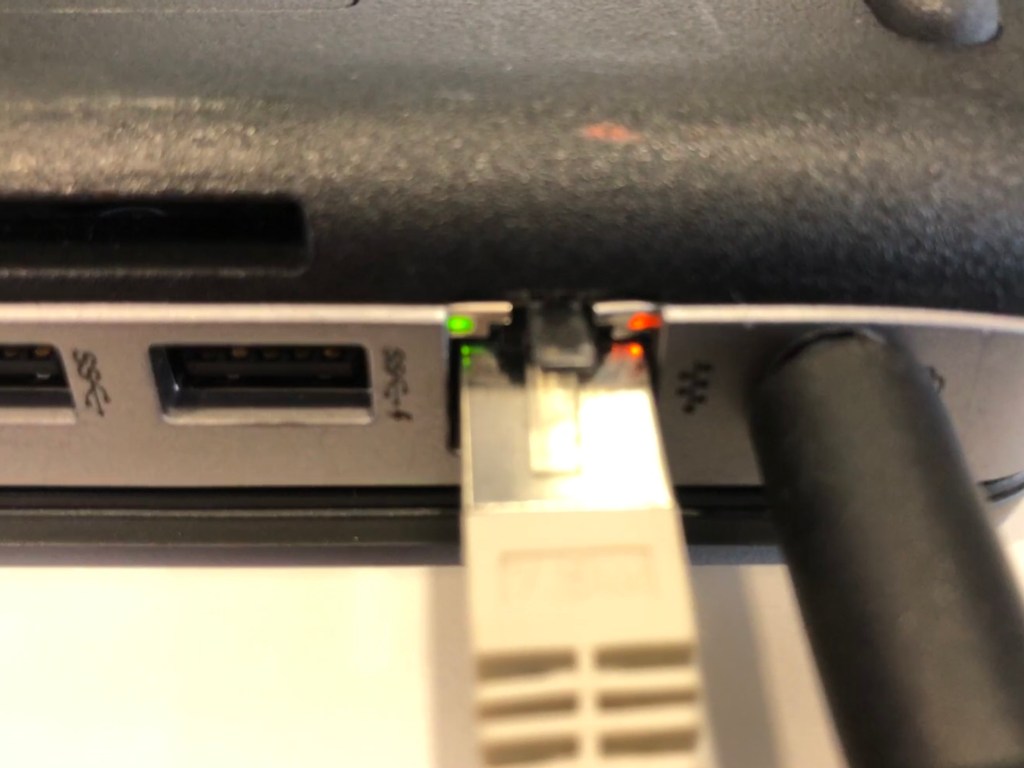 Sind alle Kabel korrekt eingesteckt, leuchten beim LAN-Kabel ein grünes und oranges blinkendes Licht.